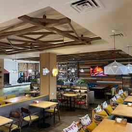 Гости могут наблюдать за процессом приготовления блюд: в кафе установлена дровяная печь, где пекут ароматную пиццу на дровах, а на мангале готовят различные блюда на углях. Также в заведении предусмотрена детская комната, где маленькие гости могут весело провести время, пока взрослые наслаждаются отдыхом.